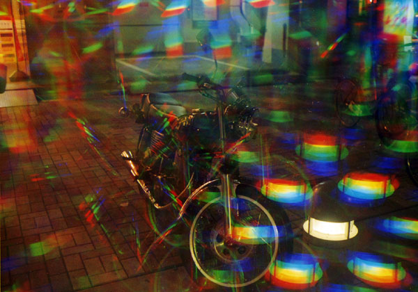 実験的写真。東急ハンズでホログラムシートみたいなやつ?虹色に光る透明なシートを見つけたんですよ。それをレンズの前に装着して夜の街を撮ったものです。アヒャヒャヒャ、こりゃすごいなぁ、何かヤヴァイ物キメたみたいだ・・・て??ちなみに一番下の写真の建物は当時ファッションビル、現在家電量販店となってます。よく写真展見に行ったり中古レコード漁ったりしたなぁ・・・遠い日の幻覚?であります。。 |