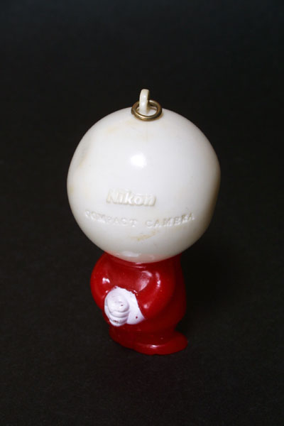 ニコン目玉おやじキーホルダー。これも10年ちょい前?同社のコンパクトカメラのイメージキャラクター?に採用されたんですよね。また復活しないかなぁ・・?なんてことを、つい最近発売されたCOOLPIX8400のデザインを見て、ふと思い出しました(笑)このキーホルダーいつもカバンにつけて持ち歩いてたんだよなぁ・・てとこまで思い出したんですけど、まさか未使用品が見つかるとは思いませんでしたよ!! ・・・てことは、ニコンだけに2個持ってたってことか?・・なんちゃってカクカク、、カバンに付けてた方はどっか行っちゃったんだよね?と思ってたら、それも見つかってやんの、何という馬鹿みたいな物持ちの良さ!?ついでに前方と後方の様子もお見せします。ちょっと凹んでるけどね、、後頭部にニコンのロゴが見えます。。 |